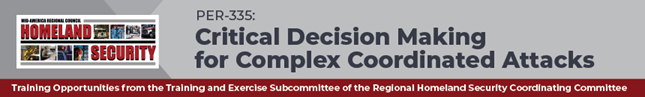 SEATS AVAILABLE- Please register. The PER335 course is a 16-hour in-person class that addresses the vulnerability of any community to a public safety situation, such as an active shooter at a shopping mall; a train derailment with hazardous chemicals; a bombing incident at a commercial district; a plane crash; or chemical, biological, radiological, nuclear, or explosive attack. These complex coordinated attacks involve multiple threats that often exceed conventional response tactics. The attacks require a joint response involving members from varying disciplines and jurisdictions.